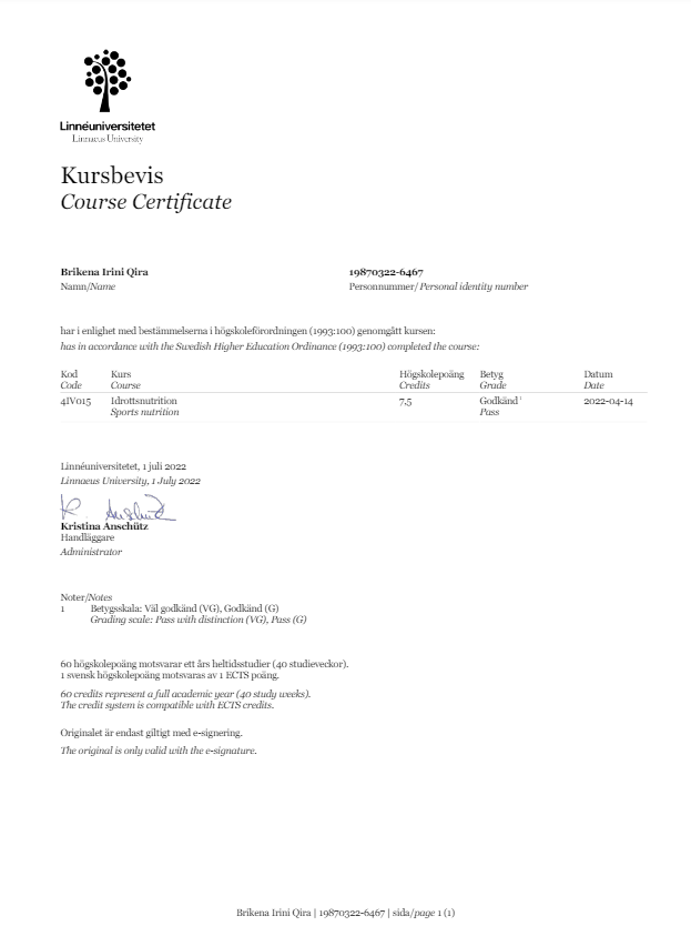 När jag flyttade till Sverige, bestämde jag mig för att fräscha upp mina kunskaper om Idrottsnutrition (många människor tränar här!) med en fristående kurs av avancerad nivå från Linnéuniversitetet.